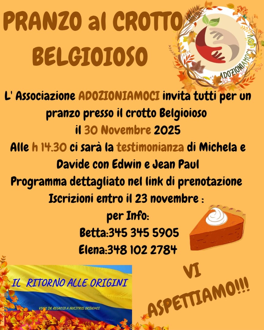 L'associazione Adozioniamoci invita tutti e tutte per un pranzo presso il Crotto Belgioioso a Chiavenna il 30 novembre alle ore 12:30.