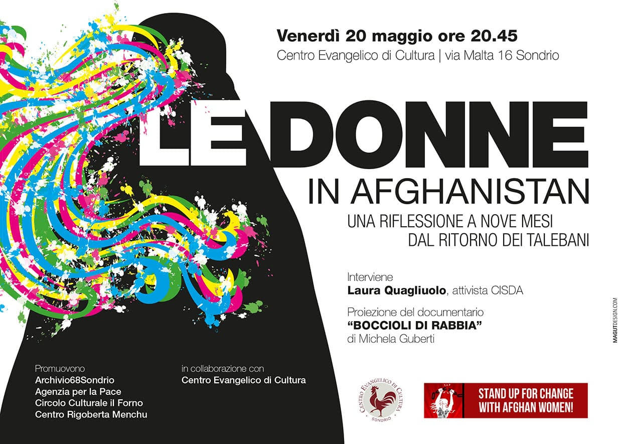 Archivio68Sondrio, Agenzia per la Pace, Circolo culturale Il forno e Centro di documentazione Rigoberta Menchù, in collaborazione con il Centro evangelico di cultura, promuovono venerdì 20 maggio alle ore 20.45 a Sondrio l'incontro pubblico "Le donne in Afghanistan. Una riflessione a nove mesi dal ritorno dei talebani".