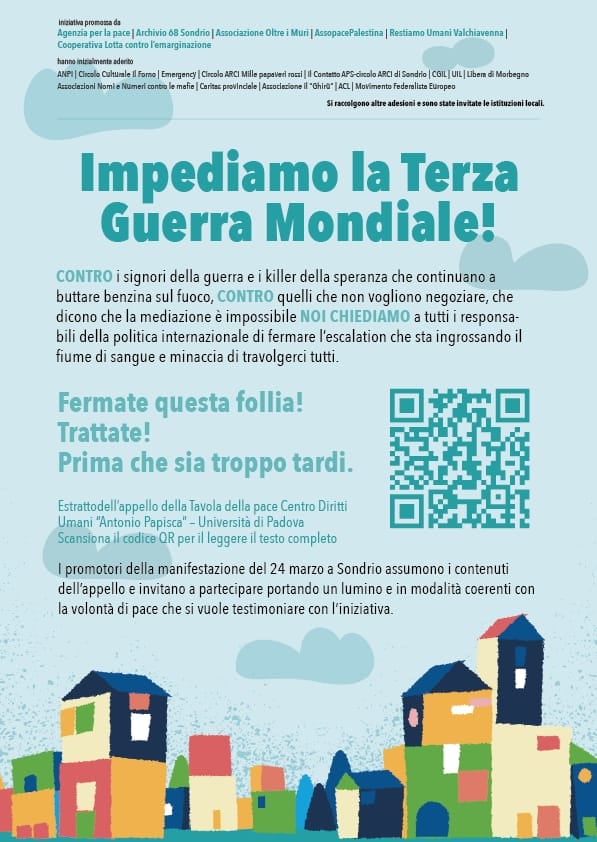 I promotori della manifestazione del 24 marzo a Sondrio assumono i contenuti dell’appello del Tavolo della Pace (http://www.perlapace.it/fermate-lescalation/) e invitano a partecipare portando un lumino e in modalità coerenti con la volontà di pace che si vuole testimoniare con l’iniziativa.