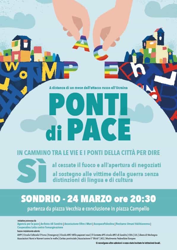 A distanza di un mese dall’attacco russo all’Ucraina Agenzia per la pace, Archivio 68 Sondrio, Associazione Oltre i Muri, AssopacePalestina, Restiamo Umani Valchiavenna, Cooperativa Lotta contro l’emarginazione organizzano Ponti di Pace per dire sì al cessate il fuoco e all’apertura di negoziati, per dire sì al sostegno alle vittime della guerra senza distinzioni di lingua e di cultura.