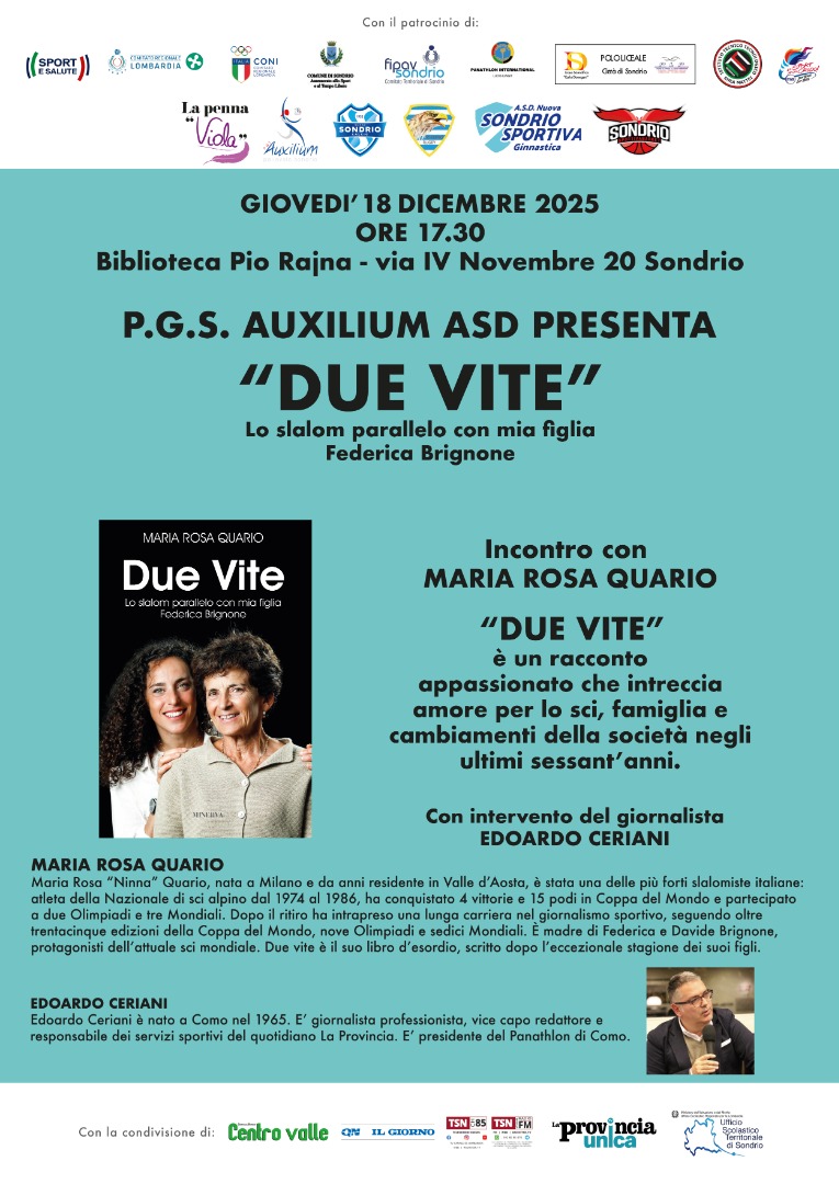 “Ninna” Quario sarà a Sondrio giovedì 18 dicembre 2025 quale madrina d'eccezione delle premiazioni del concorso “La penna Viola” che si potranno seguire nella Sala consiliare di Palazzo Muzio presso la Provincia di Sondrio, mentre alle 17.30 nel salone della Biblioteca “Pio Rajna” (Villa Quadrio) presenterà il suo libro d’esordio “Due vite – Lo slalom parallelo con mia figlia Federica Brignone”. Ad intervistarla il giornalista Edoardo Ceriani, vice capo redattore e responsabile dei servizi sportivi del quotidiano “La Provincia”.
