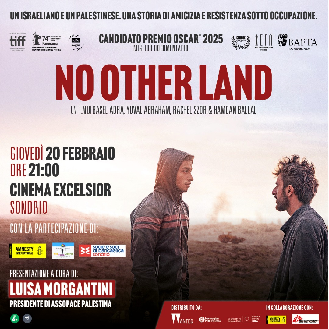 Le sezioni valtellinesi di AssopacePalestina e Amnesty International hanno il piacere di invitarvi alla proiezione del documentario 𝗡𝗼 𝗢𝘁𝗵𝗲𝗿 𝗟𝗮𝗻𝗱 𝙜𝙞𝙤𝙫𝙚𝙙ì 20 𝙛𝙚𝙗𝙗𝙧𝙖𝙞𝙤 2025 𝙖𝙡𝙡𝙚 𝙤𝙧𝙚 21:00 presso il Cinema Excelsior Sondrio