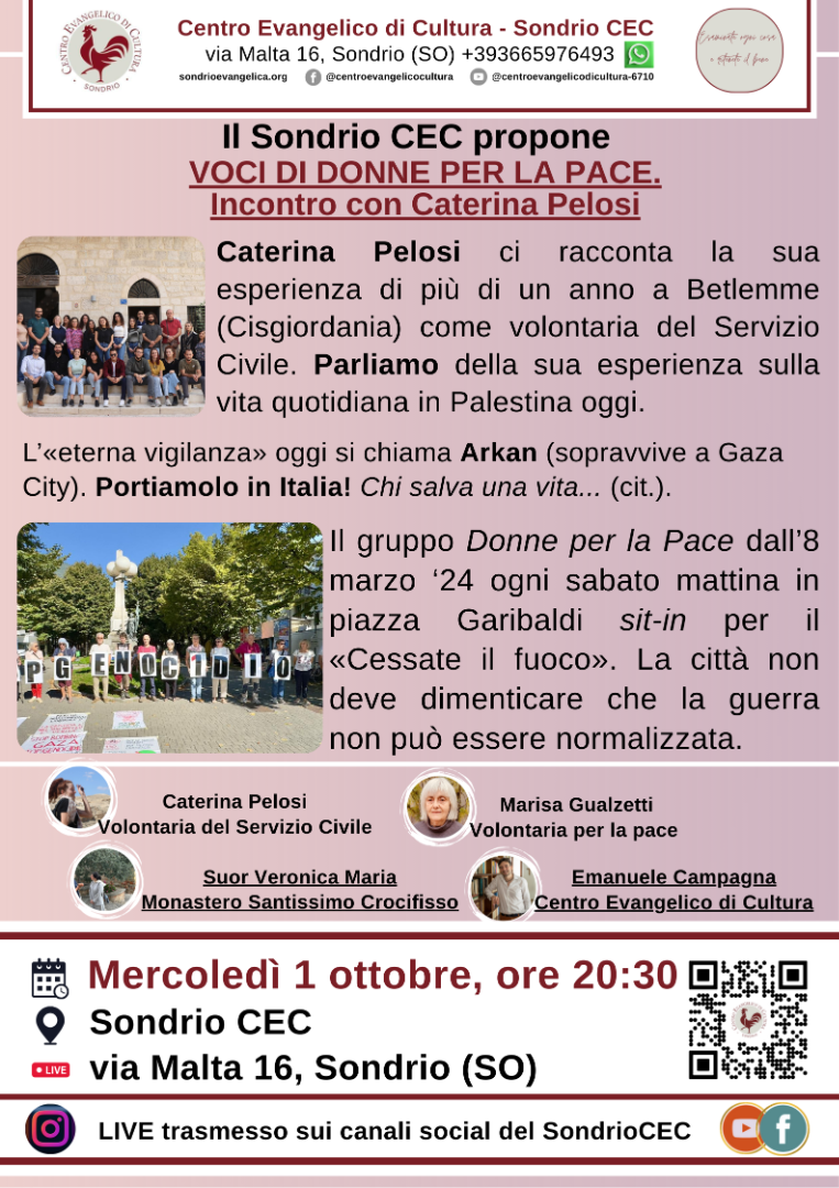Mercoledi 1 ottobre 20:30 in via Malta 16 o in streaming, il Centro Evangelico di Cultura nella sua sede sondriese ospita una serata di dialogo sulla Palestina. Interverranno Caterina Pelosi sulla sua esperienza diretta in Cisgiordania, suor Veronica Maria sulla storia vissuta di Arkan (residente a Gaza City) e Marisa Gualzetti sulla sua esperienza di volontaria con e per gli ultimi.
