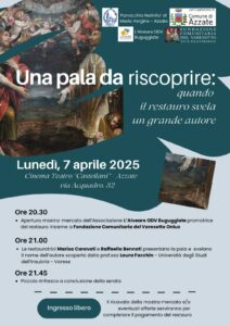 Lunedì 7 aprile, alle ore 20.30 presso il Cinema Teatro “Castellani” di Azzate, si terrà una serata-evento aperta al pubblico in cui sarà possibile ammirare da vicino l’opera “Trinità con i santi Giovanni evangelista e Carlo Borromeo”, una splendida tela seicentesca che dopo secoli rivela finalmente il nome del suo autore.