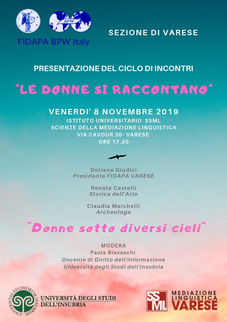 La Sezione FIDAPA di Varese apre l’attività del nuovo biennio 2019-2021-Presidente Doriana Giudici- inaugurando un ciclo di incontri dedicato alle donne: “Le donne si raccontano” patrocinato dall’Istituto Universitario SSML Scienze della Mediazione Linguistica di Varese e dall’Università degli Studi dell’Insubria